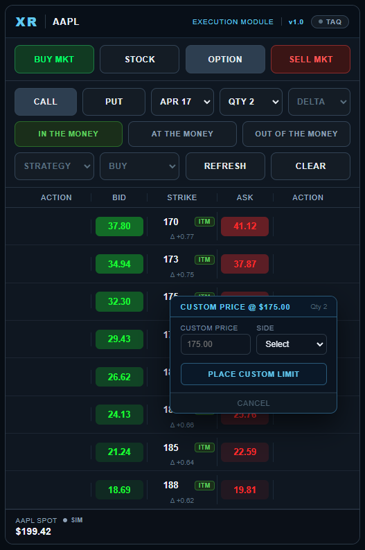 XR is built around a simple principle: Replace decades-old “legacy” infrastructure technology, which requires multiple steps to execute a trade with modern AI-designed architecture that places the trader directly inside the underlying stock-chart to monitor the “Price-Action”, that always triggers the execution of the trade order. Just the chart and the trade. The Trader submits the option order directly from the Option mode ladder chart. XR sends the order through the platform’s native routing and execution API — exactly as it normally would. What changes is the workflow: the Trader never leaves the price‑action.